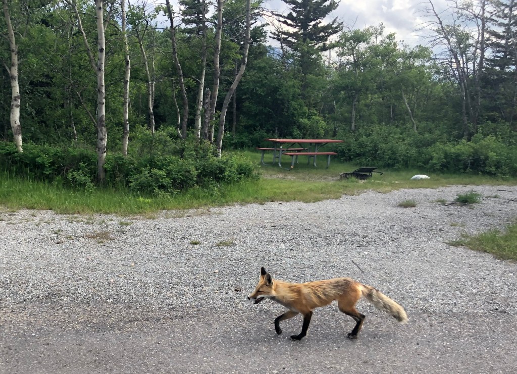 ~5:00 p.m. Nothing much to read. Time to write. Summer is for walking away passivity. We are at St. Mary’s Campground. Have permit. Snow on high passes reported to be melted. Just passed a large fox—red, with long golden tail—cruising along the campground loop road. On an empty closed loop. I was walking back from the Visitor Center where I went to see about transport to Chief Mountain. Only option is a taxi out of East Glacier for $80 per person! We decided to try hitching a ride in the morning instead. Packs will be heavy, with extra fuel (not sold in Polebridge), microspikes, and bear spray. I dozed some in the shuttle to here. Really want a nap. It was sooo hard to sleep on the train. I kept sliding down the large seat, and the aisle lights were right in my eyes. We had a nice breakfast on the train about 6:00 a.m.