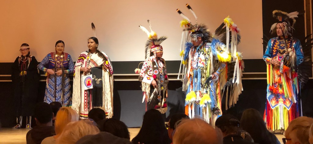 ~8:45 p.m. We went to the Indian (Blackfoot) songs and dances at the Visitor Center. Very fun! Regalia (proper word they said) a blend of traditional and modern. Some looked like maybe inspired by sage grouse and other lek-type birds. Sure enough later in the program there was one called “Chicken Dance” that was exactly that. By a 6th grader no less! It’s still light even with clouds. Ready for tomorrow. Need that ride!