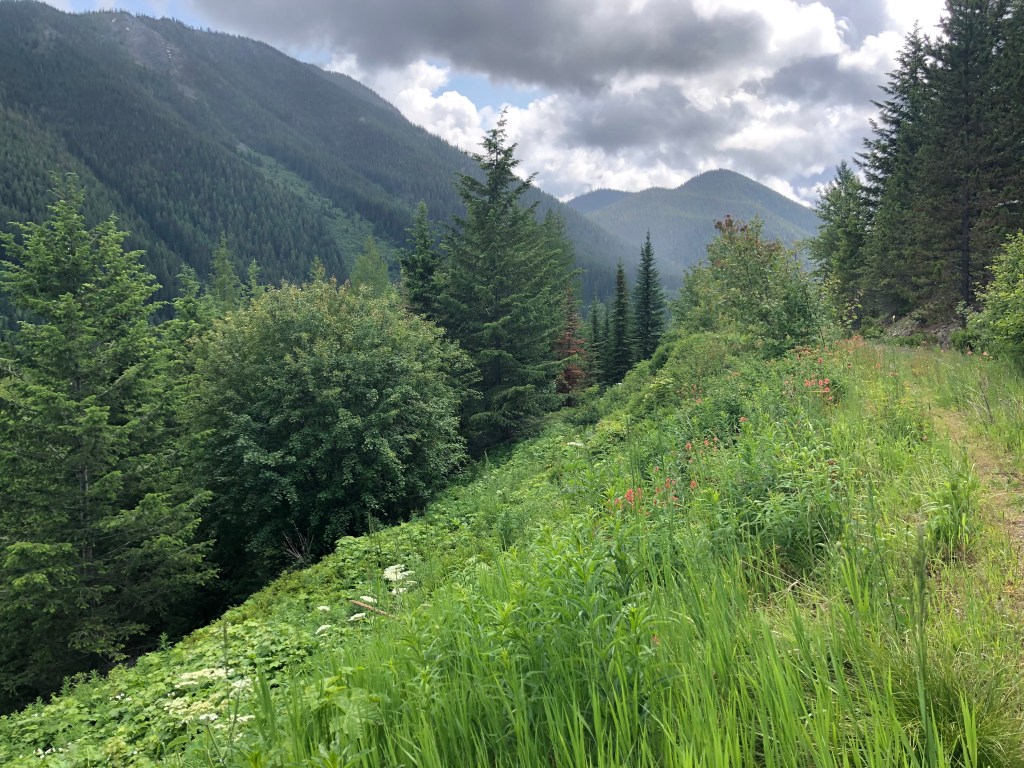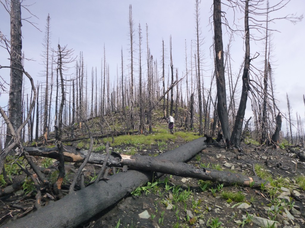 We stayed a while, taking pictures, enjoying the views of the country around, and exploring the top. The sky was still not clear and it was very windy. But where did the trail continue? Cabin supposedly at the end of a short spur trail. We walked the whole circle around, finding only the trail we arrived on. Other directions were steep cliffs and vertical slopes. We backtracked to the cairn. Aha! Two cairns and a teeny trail between them and around a rock outcrop and then onwards. Be more observant! We, and the trail, picked our way across the steep, steep mountainside, with the peak on our left and forest unending below to our right. Then we dropped to a ridge on the north side, enjoying views all the way along, and lots of flowers. The burn area covered the mountains across the valley to the east. At some point, I’ll need to check the map where, we re-entered unburned forest and the junction where TR 26 left us and we joined the Blue Creek Trail. Down, down. Oh yeah, and all this morning from after breakfast at our camp in the saddle, through the burnt forest and the bushwhack and up and over the mountain and down again, was with NO water at all. So we were getting thirsty for sure. At least there was regular trail going down, and healthy forest not burned. Except for all the fallen trees across the trail. The Digest says the area had been cleared but apparently there have been lots of newly fallen trees since. So once again we slowed to a crawl—or a climbover, or a bushwhack around—to progress.