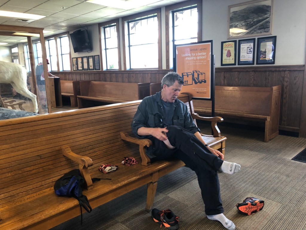 Later it was time to head back to catch the train. Still light—daylight until very late so far north. Lots and lots of people in the station for the train by then. We got our gear and checked email notifications. The train was running late. Then the train was running even later. R played the piano for minute. (Yes the waiting room had a piano.) Later a fat bubba-like guy played piano for quite a while and he was really, really good at it. The train finally arrived around 10:30, everyone tired. Chaotic boarding with so many people. We were assigned two different already-occupied places in two cars before the conductor finally seated us downstairs in the disabled area. We tried to sleep but it was even harder than on the trip out. I was wishing for a bunk. Spokane around 4:00 a.m. after passing the time zone change. Lyft driver. I opened the passenger door which immediately got hit by a pickup truck. There was this whole thing then with the women in the truck and a policeman. So groggy no sleep. Finally the Lyft driver took us to J’s. I spent the next week trying to straighten out the Cruze registration (no luck), planning an alternate road trip, and getting cabin fever. So that’s the end of our first PNT hike, about 95 miles. A disappointment in that we had to bail, but a good hike while it lasted. Resolved to be more fit by next summer. (Little did we know….)