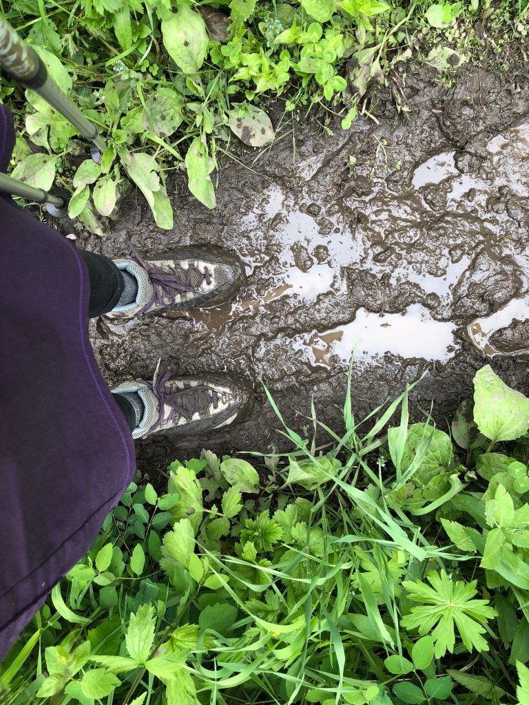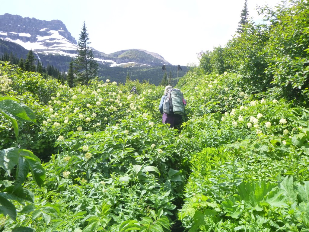 Off on the trail at about 11:30. Rain gone but still overcast, low clouds on the mountains. Warmed up with hiking. Still going to be pretty slow and out of shape for at least a few days. Felt good to be walking. Muddy trail down into the Valley, switchbacks, small streams, log bridges. A number of other hikers, all coming the other way, not passing us in our direction. Great spreading meadows with wildflowers. Dandelions already gone to puffball seed. Lupines & geranium-like ones and comps and those tall gray-leaved bushes with the fragrant flowers, and some trillium-like flowers. Plus the mountainsides in Glacier are so steep, with geologic layers all different colors. First look over the Belly River. (I wonder if the name is a variation of “Valley” or something else.) A vast beaver pond just below to our right. We lunched about 1:30-2:00. At 3.2 miles. Slow going in the slippery squooshy mud.