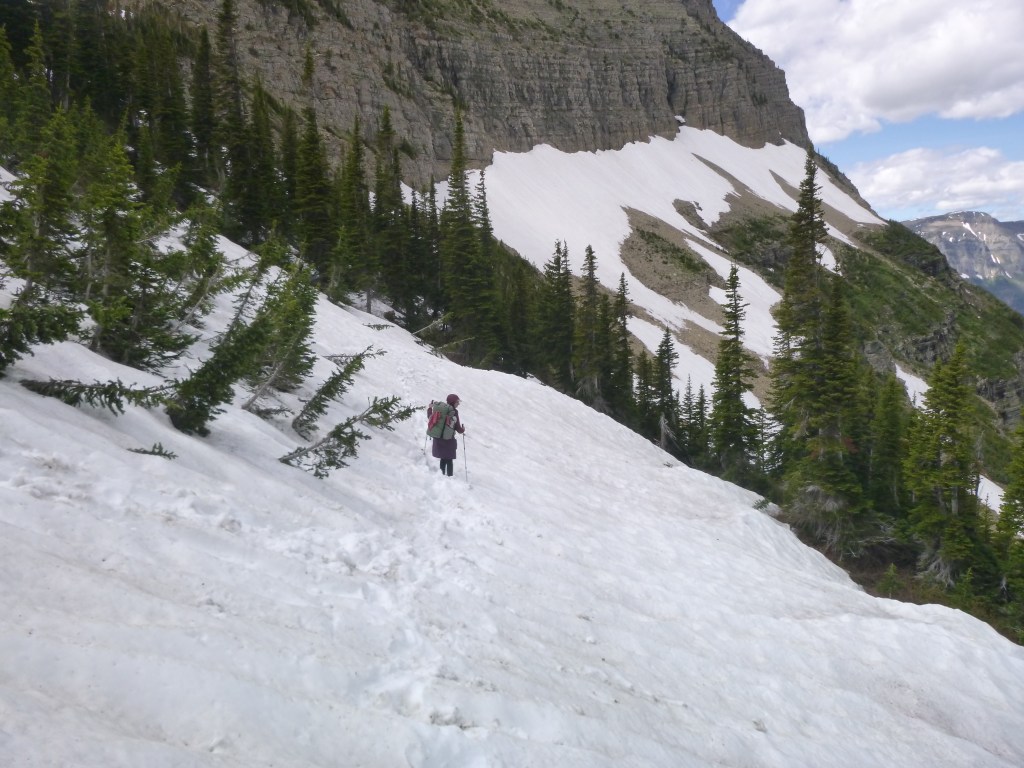 Our morning’s route took us through the forest and high berry bushes above the Mokawanis River, gradually climbing until the cirque below Atsina Lake. Fantastic falls all down the side, Mokawanis Cascade. Several sections. The red and green horizontal rock layers make the water spread out and cascade down in splashy stair steps. Then at the head of the cirque, high above, a steeper cliff made a wide curtain of water, and another narrower falls stream nearby. Our path took us way up the side of the valley in switchbacks to the lake. We thought to stop for a snack by the lake but with all the high vegetation and the slope there wasn’t a good opportunity so we kept going. The Mokawanis River crossing was the wet one NZ guy told us about. I went barefoot since my shoes are slow to dry. It looked like there might be a rock hop to the right of the path, but at the far side it dead-ended into a thick willow overhanging the deepest channel. No going there. I angled upstream with poles for balance. Sooo coooold! Feet burning and then numb. Water to my knees but not so fast as to unbalance my steps. Finally ashore! R has much more sensitive feet (he doesn’t go barefoot) and quick-dry shoes so he waded across shod. Repackaged, we started the switchbacks up the side of the upper cirque, looking up at Atsina Falls, and around through vast slopes of yellow glacier lilies. The climb wasn’t too steep, past a little lake (no name on the map) through patchy short alpine forest, until shortly before the final steep climb we started crossing some stretches of snow. It was soft but not slushy, with lots of tracks to follow, so not hard or worrisome. Slow and steady climbing wound through the snowy woods to the top! Another couple up there was having lunch at the overlook. They were trying to scope out the way down the far side, since the top overlooks a sheer cliff higher than the treetops below. We speculated with them a bit, and she went on a reconnaissance and apparently found the trail, because they soon took off in that direction.