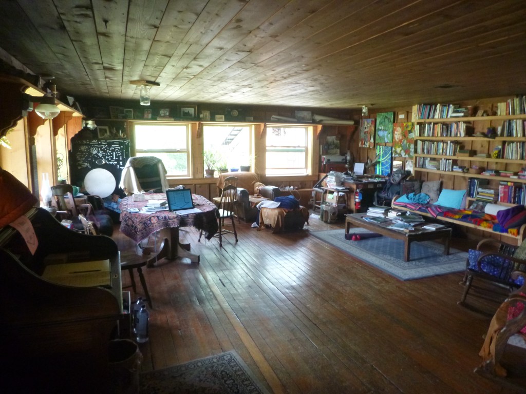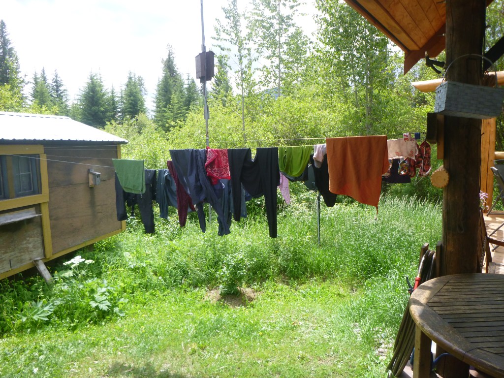 On the morning of Wednesday July 3 we woke to find our socks finally dry(ish) from being on the windowsill overnight. The bunk room window looked out into the long lean-to greenhouse so the open window wasn’t affected by the rain. The morning it was still raining. We thought, well, that’s why we brought rain suits, and we can hike in the rain. We showered and got organized. The family dad was teaching the little girl, nearly 3, to sing Frere Jacques. Cute. I wrapped my knee thoroughly with the wide red compression wrap. Don’t remember what I had for breakfast. Granola maybe? R got up a little later. So dark in the hostel with cloudy rain outside. Both the electric lights and the propane lights are dim. Headlamps needed. I used up a pair of lithium batteries in 2 days. After we were all sorted and packaged—R was looking for missing items until the last minute—we set out around 10:30 a.m. in a steady sprinkle, not too bad. The wrap helped my knee feel better. We took some last photos of Polebridge.